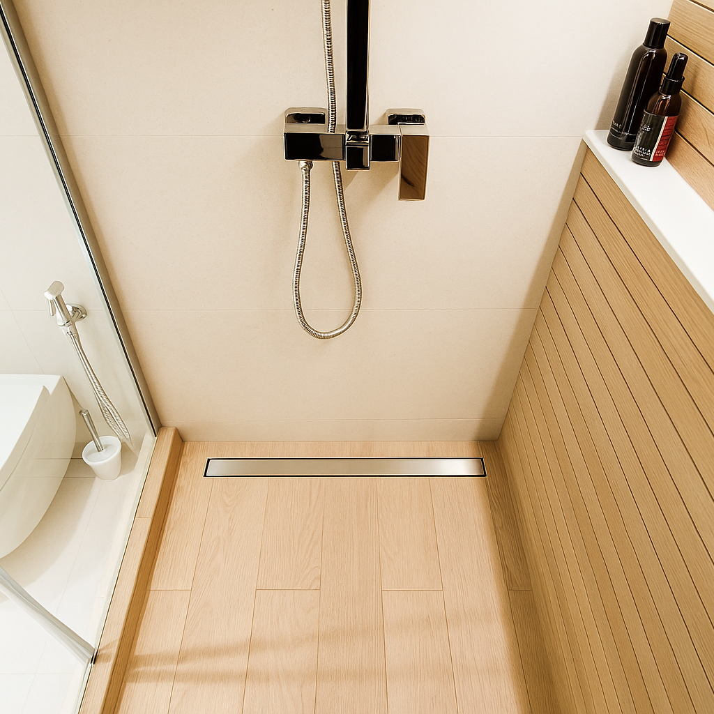 A stainless steel shower drain where the line becomes the essential element: discreet, continuous, and precise.